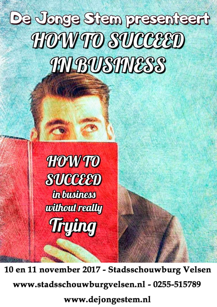 Met “How to succeed in business without really trying”, de Pulitzer en Tony awardwinnende musical, gaat De Jonge Stem na het succes van West Side Story dit jaar voor een musical met een knipoog. Een knipoog naar het bedrijfsleven, de jaren 60 en de toenmalige heersende dubbele moraal. Een eenvoudige glazenwasser, J. Pierrepont Finch, probeert via de aanwijzingen van een boek ongemerkt en zonder al te veel moeite op te klimmen naar de top van de bedrijfsladder. En in een wereld waar niemand echt lijkt te weten wat de ander eigenlijk doet, lijkt dat ook nog eens te lukken. Of toch niet?