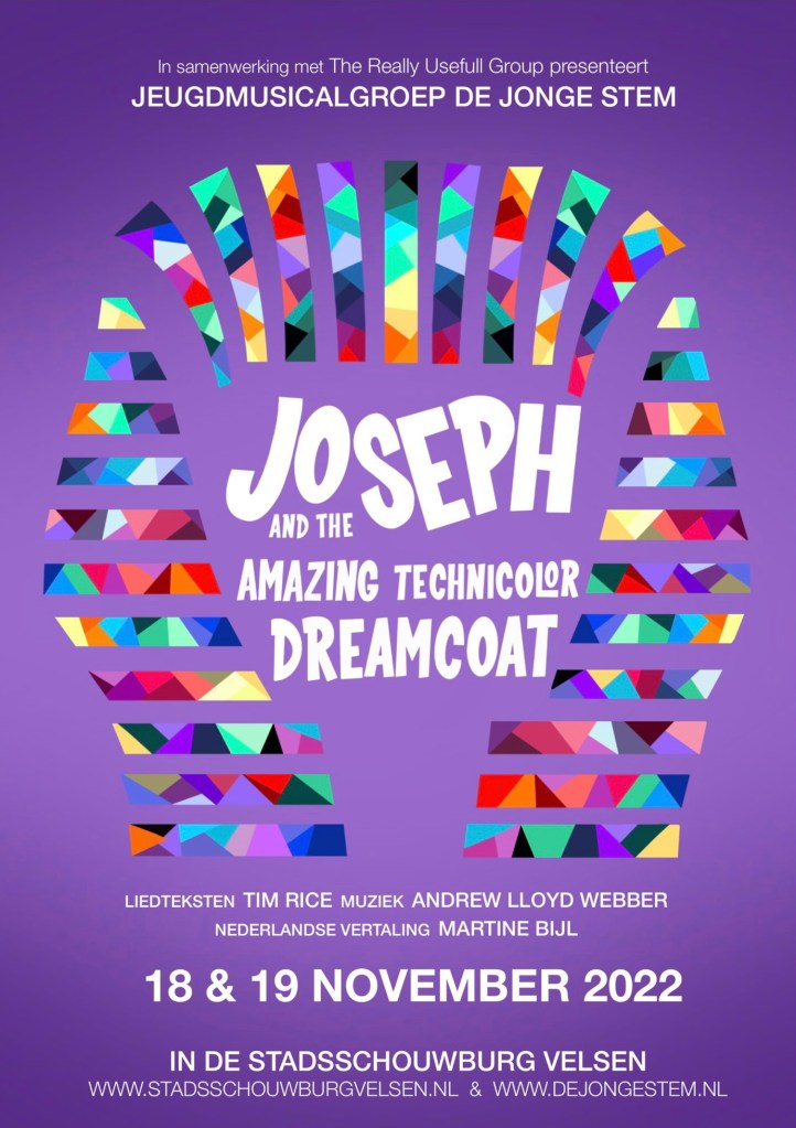 Deze musical is gebaseerd op het Bijbelse verhaal van Joseph, een van de twaalf kinderen van Jacob. Joseph heeft het talent om dromen te verklaren en daarmee de toekomst te voorspellen. Dit maakt hem tot het lievelingskind van Jacob. Joseph krijgt dan ook een geweldige kleurenjas cadeau wat zijn broers en zussen tot jaloezie en waanzin drijft. Nadat zij hem als slaaf verkopen, begint Joseph aan een lange reis. Hij komt terecht bij Potifar, een zakenman die Joseph wel kan gebruiken binnen zijn bedrijf. Wanneer de vrouw van Potifar Joseph ziet, moet en zal zij hem verleiden. Als Potifar hier achter komt, wordt Joseph direct naar de gevangenis gestuurd.